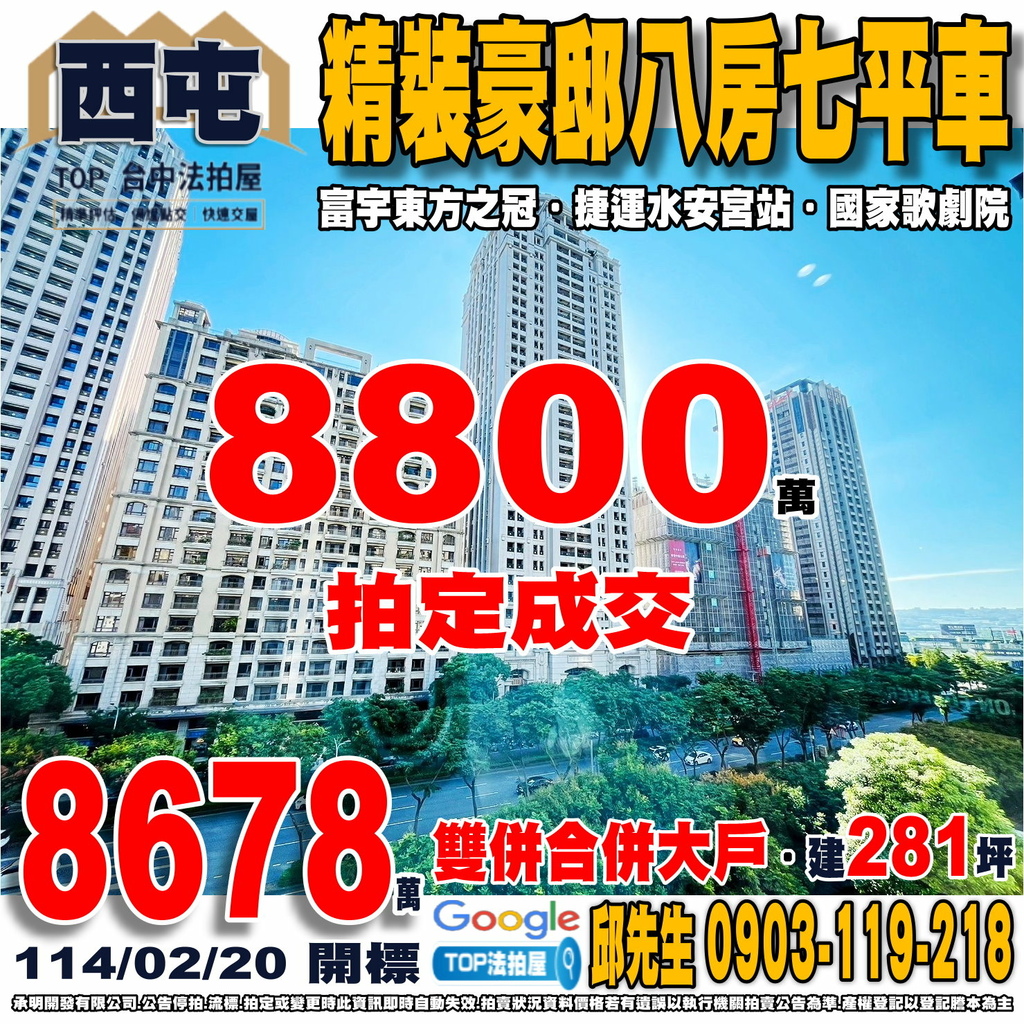 台中法拍屋》精裝豪邸八房七平車|雙併合併大戶|富宇東方之冠|近國家歌劇院