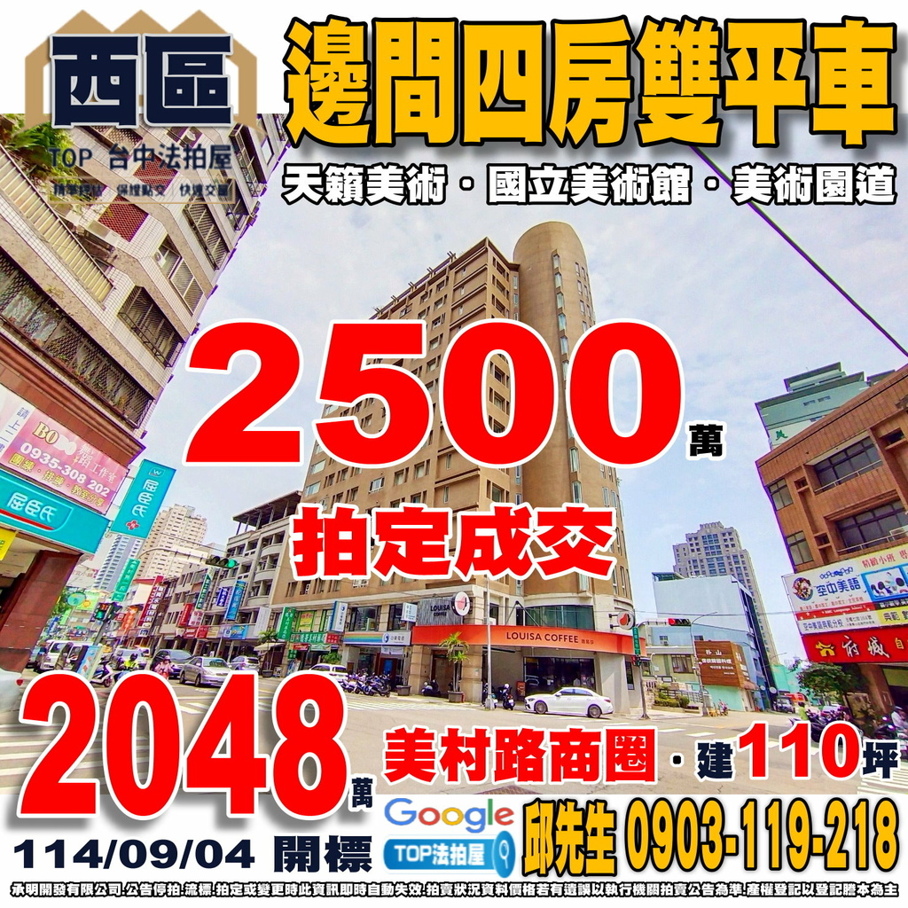台中法拍屋》邊間四房雙平車|天籟美術|近美術園道