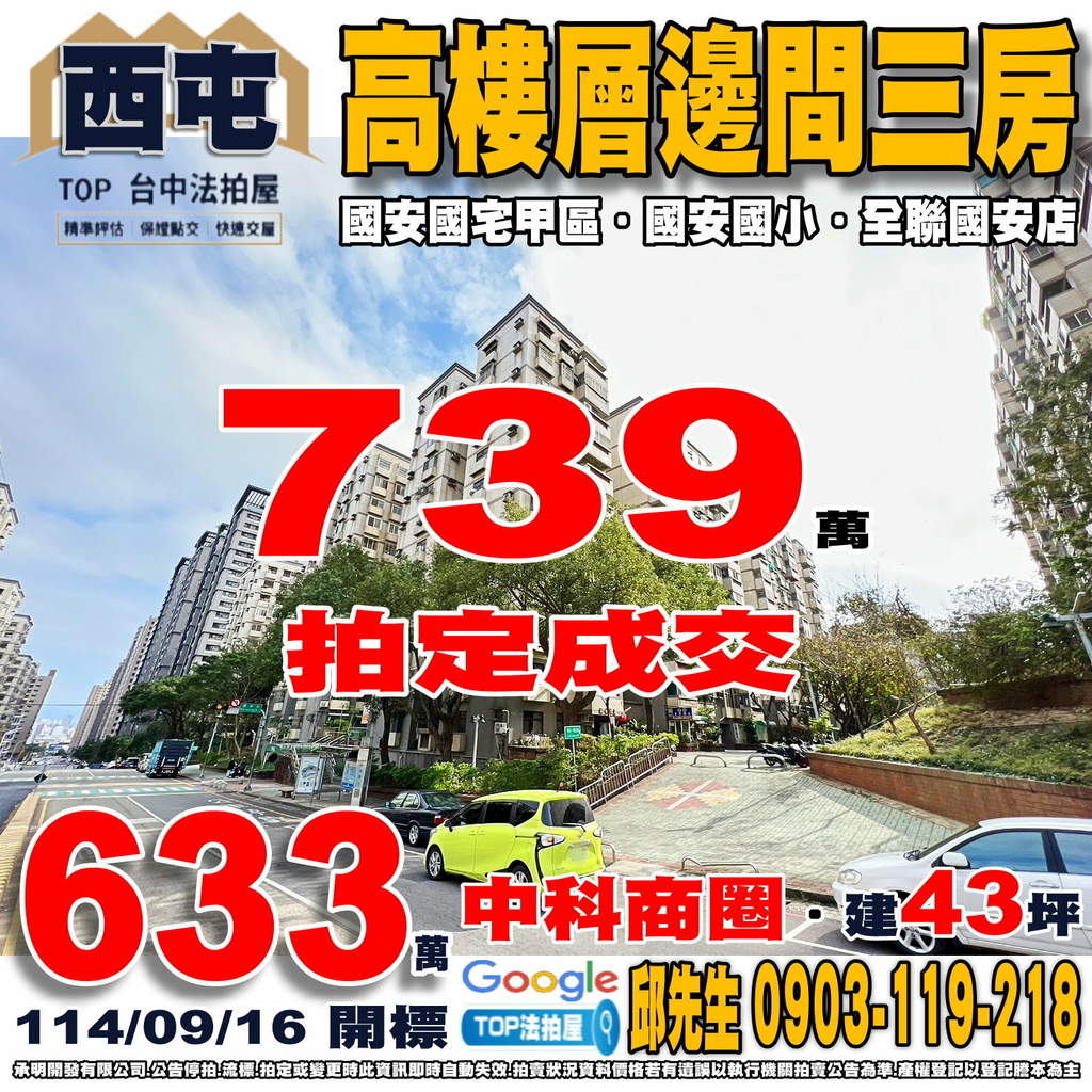 台中法拍屋》高樓層邊間三房|國安國宅甲區|國安國小