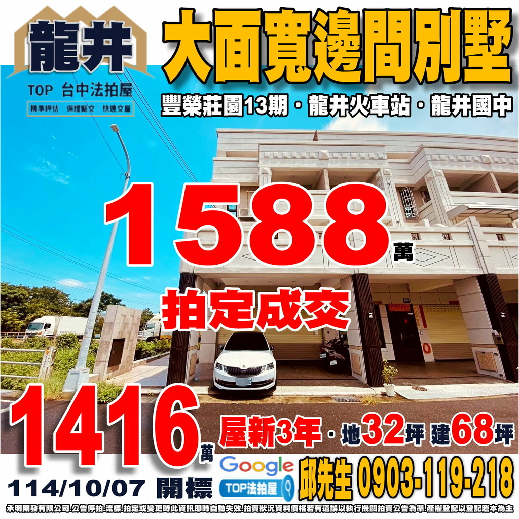台中法拍屋》大面寬邊間別墅|豐榮莊園13期|屋新3年|龍井國中