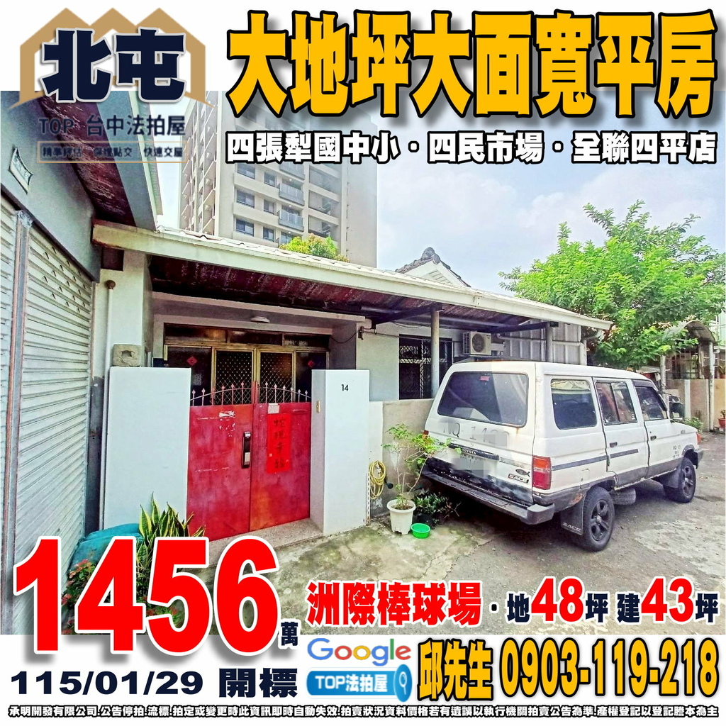 台中法拍屋》大地坪大面寬平房|四張犁國小