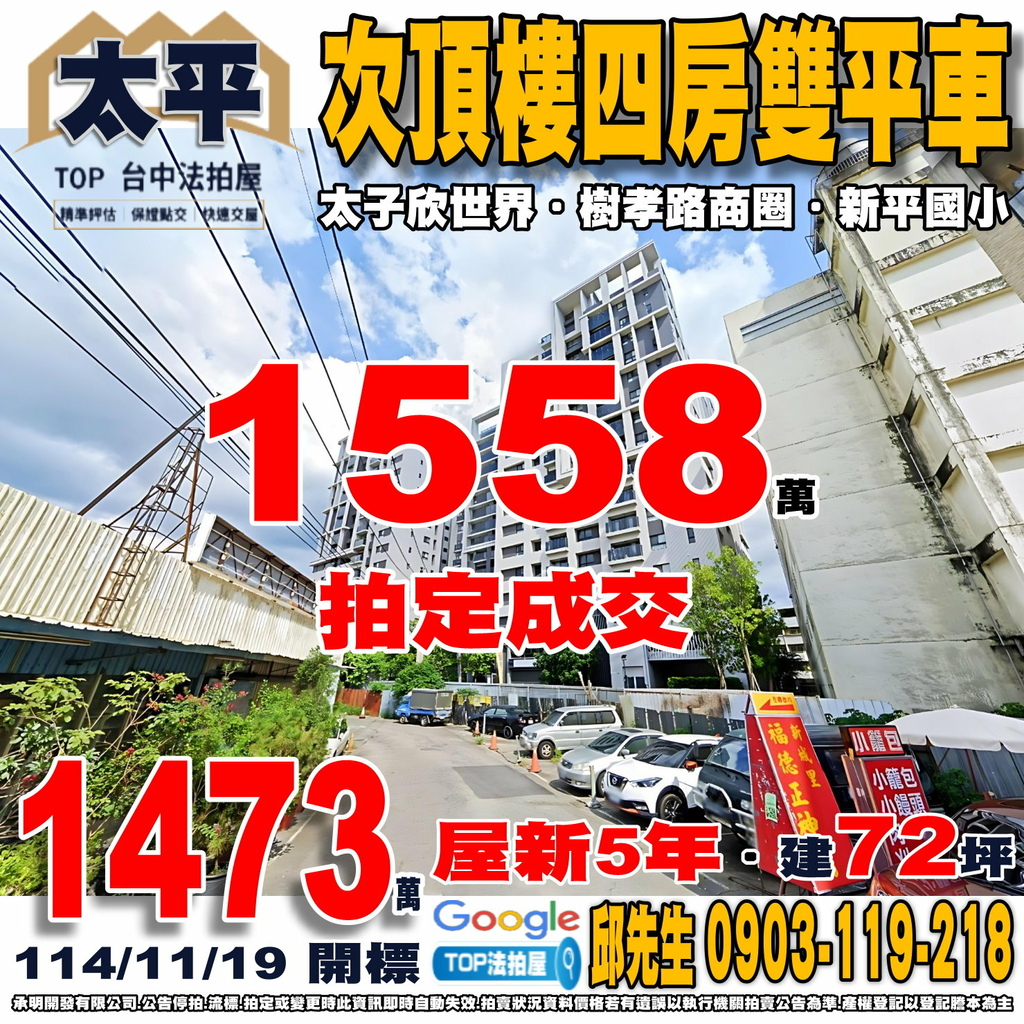 台中法拍屋》次頂樓四房雙平車|太子欣世界|屋新5年|樹孝路商圈