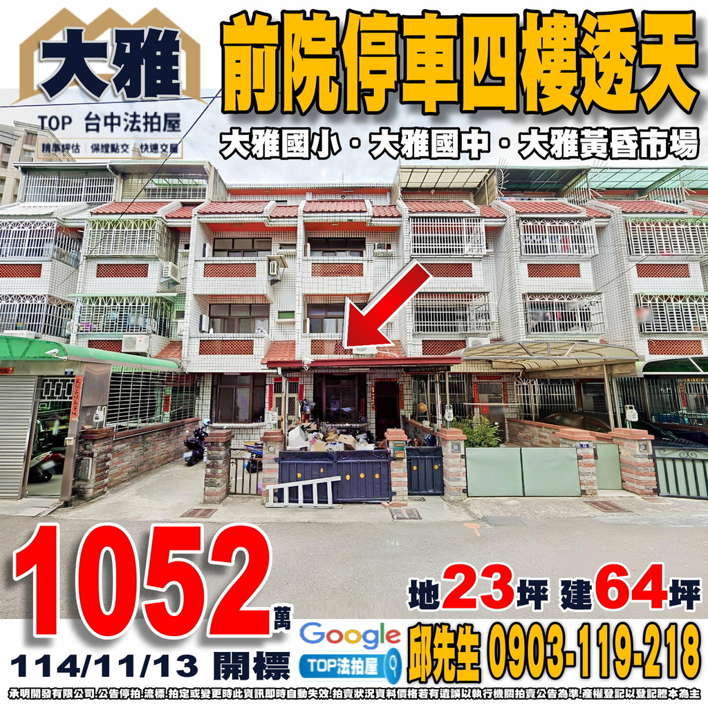 台中法拍屋》前院停車四樓透天|大雅國中