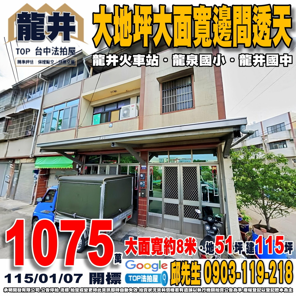 台中法拍屋》大地坪大面寬邊間透天|龍井國中