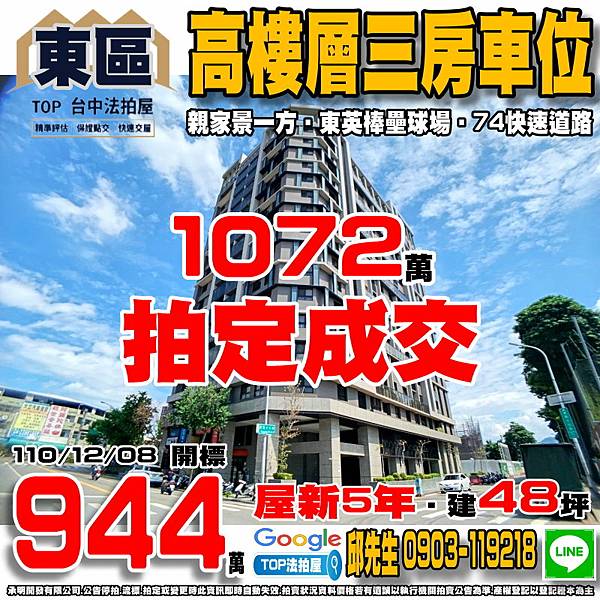台中法拍屋》高樓層三房車位|屋新5年|親家景一方|近東英棒壘球場