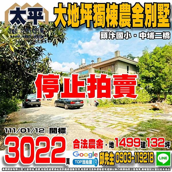 台中法拍屋》大地坪獨棟農舍別墅|合法農舍|近頭汴國小