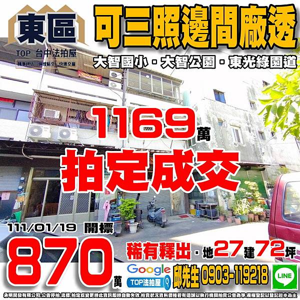 1110119 台中市東區東光園路100巷34弄1號 可三照邊間廠透 大智國小 大智公園 東光綠園道 TOP法拍屋 承明法拍屋