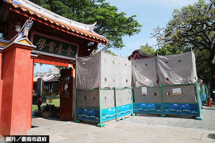 文資處說明,2016年2月6日地震,造成國定古蹟臺南孔子廟大成殿正脊、規帶斷裂、西廡屋面前傾及壁體與山牆分離、明倫堂外牆龜裂等損壞情形。自2018年6月開始啟動修復後,為考量施工期間的遊客觀覽需求,規劃採「分期分區施工」,設置施工圍籬以區隔施工區及參觀動線,等各區施工完成之後即開放民眾參觀,迄今已陸續開放明倫堂、入德之門、東西大成坊、大成門等。